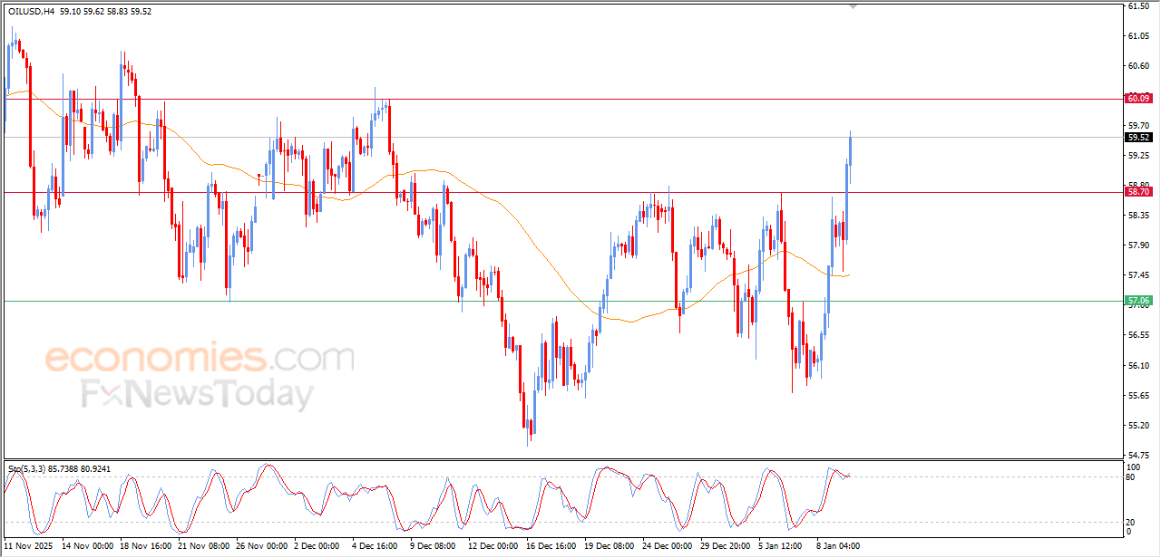 The (crude oil) price rose higher in its last intraday trading, to breach the key resistance at $58.70, taking advantage of the dynamic support that is represented by its trading above EMA50, with the dominance of strong minor bullish wave on the short-term basis, besides the emergence of positive signals on relative strength indicators, despite its stability in overbought conditions.