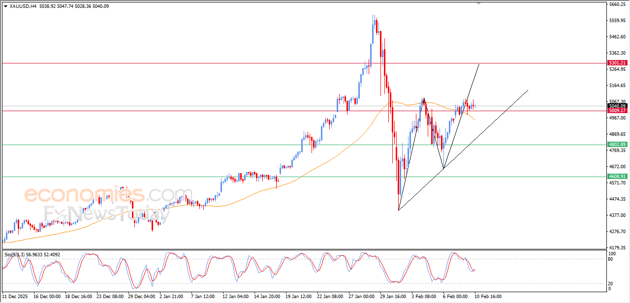 Gold price witnesses fluctuating trading on its last intraday levels, in attempt to gain bullish momentum that might help it to recover and rise again, taking advantage of its stability above $5,000, and there is a dynamic support that is represented by its trading above EMA50, besides the emergence of positive overlapping signals on relative strength indicators, after offloading its overbought conditions, opening the way for moving higher in near term basis.