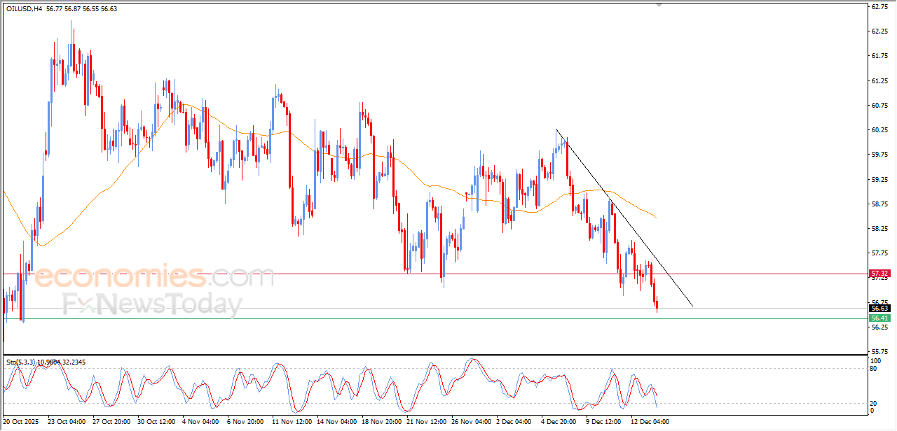 The (crude oil) kept declining in its last intraday trading, after breaking the key support at $57.35, amid the dominance of the bearish trend line and its trading alongside steep minor trend line on the short-term basis that supports this bearish trend, with the emergence of the negative signals on the relative strength indicators, despite reaching oversold levels.