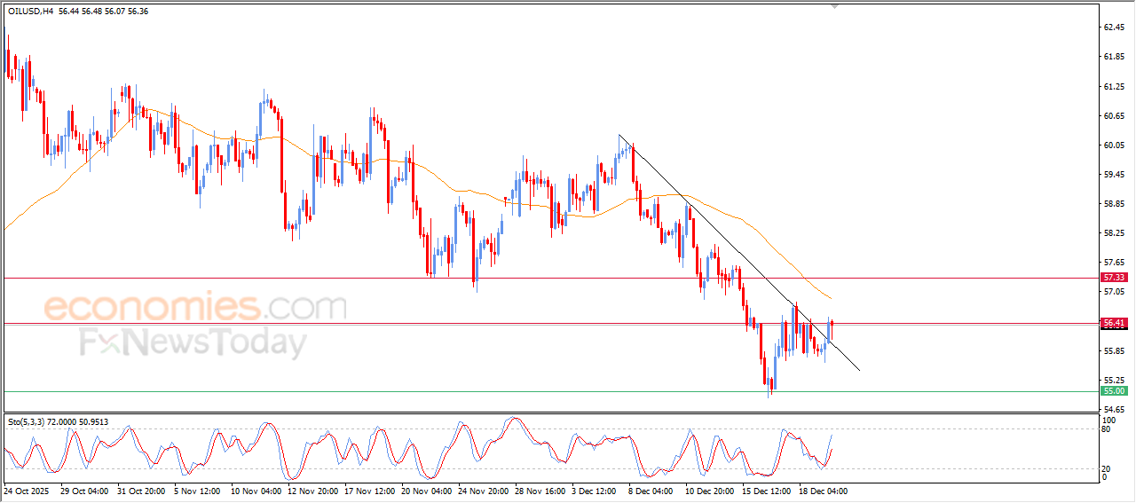 The (crude oil) rose on its last intraday trading, breaching minor bearish trend line on the short-term basis, attacking the resistance level at $56.40, supported by the emergence of the positive signals on the relative strength indicators, after reaching oversold levels, on the other hand, the price remains under negative pressure due to its trading below EMA50, reducing the chances of the recovery sustainably on the near-term basis.