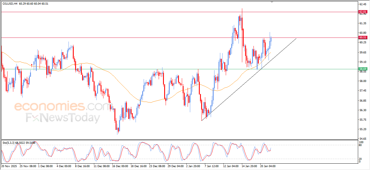 The (crude oil) price rose in its last intraday trading, reaching our morning suggested target at $60.50 resistance, supported by its continued trading above EMA50, under the dominance of the main bullish trend on short-term basis, besides the emergence of positive signals from the relative strength indicators, after offloading its overbought conditions, opening the way for achieving more gains in the upcoming period.