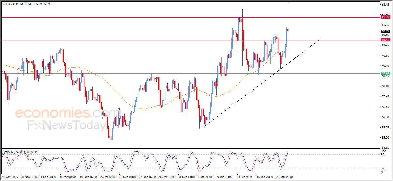 The (crude oil) price settles on clear gains in its last intraday trading, breaching the key resistance at $60.5, supported by the emergence of positive signals from relative strength indicators, despite reaching overbought levels, with the continuation of positive pressure due to its trading above EMA50, under the dominance of the main bullish trend on short-term basis.