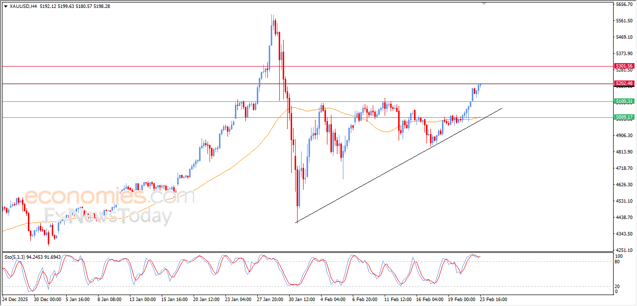 Gold price rose in its last intraday trading, to reach our morning expected target at $5,200, amid the continuation of the dynamic pressure that is represented by its trading above EMA50, with its trading alongside minor bullish trend line on the short-term basis, offloading its overbought conditions from relative strength indicators, pushing it to achieve new gains.