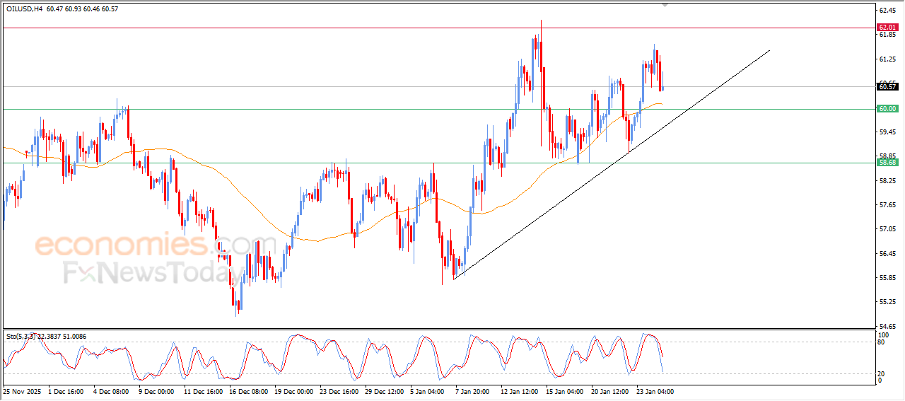 The (crude oil) price settles on a decline in its last intraday trading, amid the emergence of negative signals on relative strength indicators, after reaching overbought levels, attempting to gain bullish momentum that might help it to recover and settle again, amid the continuation of the dynamic support that is represented by its trading above EMA50, which reinforces the stability of the main bullish trend on a short-term basis, especially with its trading alongside trendline.