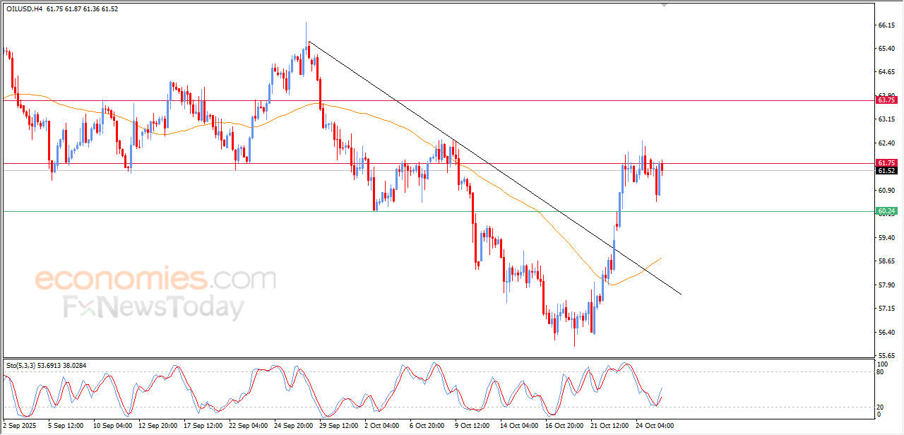 The (crude oil) settles high in its last intraday trading, in attempt to breach the solid resistance level at $61.75, supported by its continuous trading above EMA50, under the dominance of bullish corrective wave on the short-term basis, besides the emergence of the positive signals on the relative strength indicators, after reaching oversold levels.
