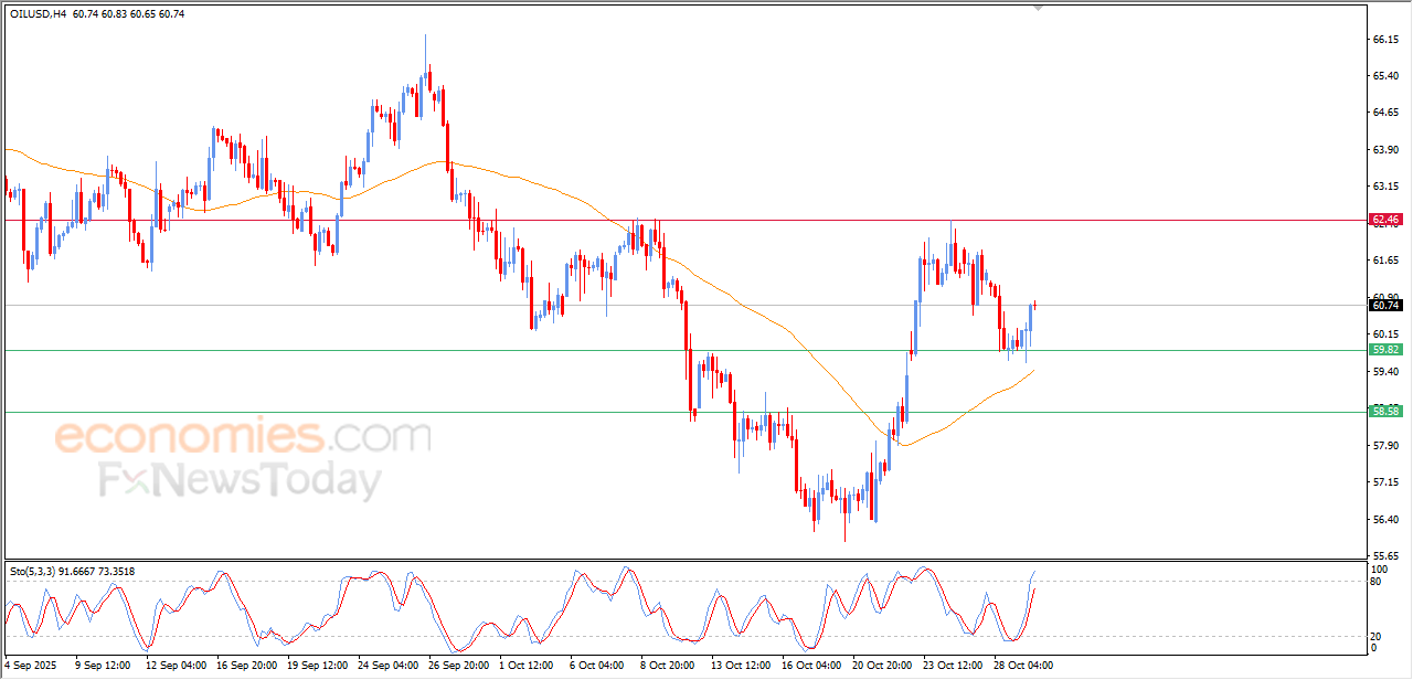 The (crude oil) surged high in its last intraday trading, affected by the stability of the support level at $59.80, gaining bullish momentum that helped it to achieve these gains, supported by its trading above EMA50, and under the dominance of the bullish corrective trend on the short-term basis, besides the emergence of the relative strength indicators, reaching the overbought levels, exaggeratedly compared to the price move, which might force it to rebound slightly or fluctuate on the intraday basis.