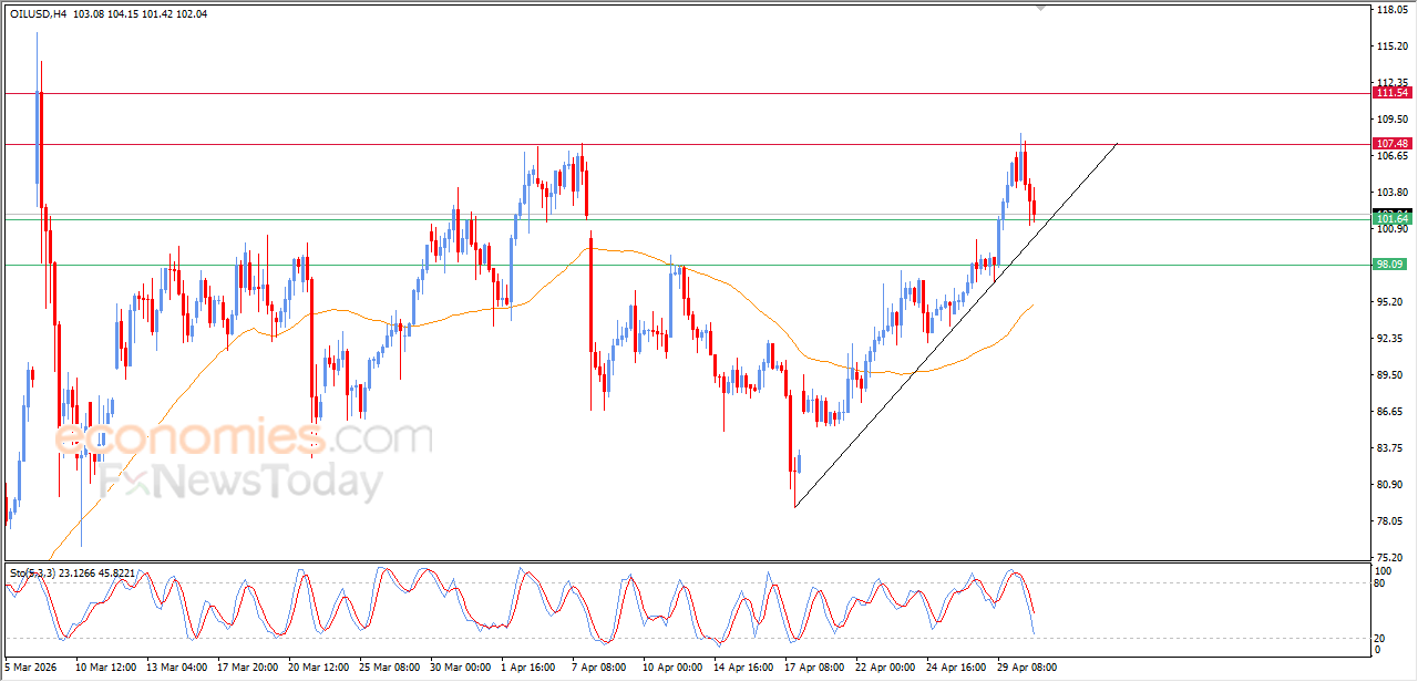Crude oil prices kept declining in its recent intraday trading, in attempt to look for higher low to take it as a base to help it gain the required positive momentum for its recovery, amid the emergence of the negative signals from the relative strength indicators, to lean at $101.50 support, amid the continuation of the dynamic support that is represented by its trading above EMA50, which reinforces the stability and dominance of the main bullish trend on the short-term basis.