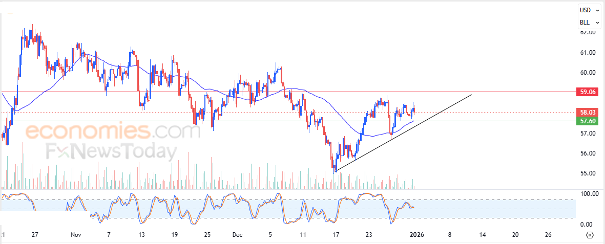 The (crude oil) price declined in its last trading on the intraday levels, amid the emergence of the negative signals on the relative strength indicators, attempting to gain bullish momentum that might help it to recover and rise again, amid the dominance of bullish corrective wave on the short-term basis and its trading above EMA50, reinforcing the chances for recovery in the upcoming period.