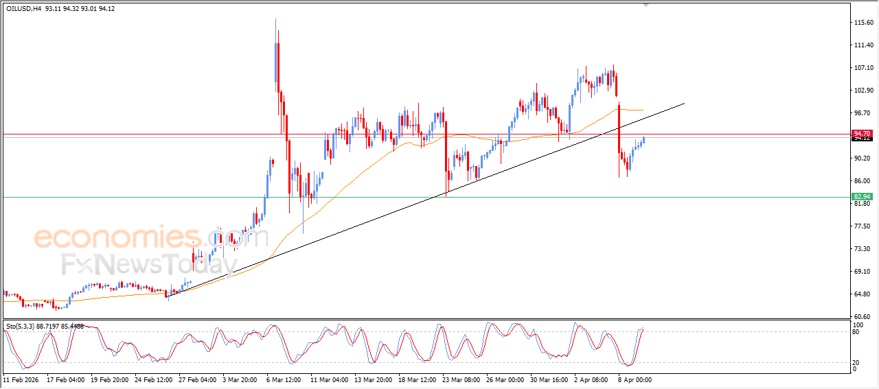 Crude oil prices extended their early gains during recent intraday trading, to retest the key resistance at $94.70, amid the dominance of bearish corrective wave, affected by breaking main bullish trend on the short-term basis, with a negative and dynamic pressure that is represented by its trading below EMA50, reducing the chances of full recovery on the near-term basis, especially with the relative strength indicators reaching overbought levels, exaggeratedly compared to the price move, with the emergence of negative overlapping signals, to indicate forming negative divergence that intensifies the negative pressure on the price.