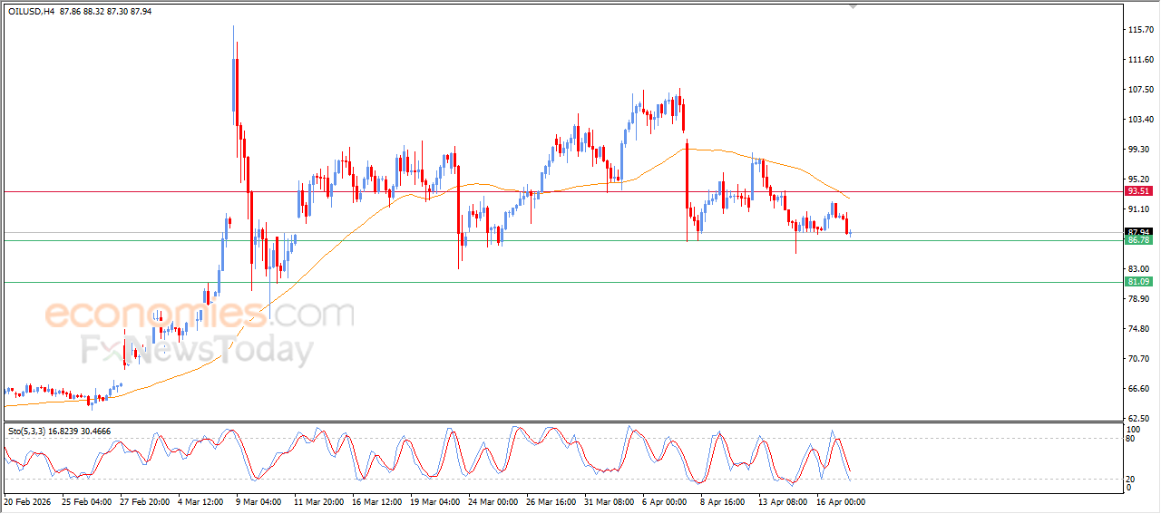 Crude oil price declined in its recent intraday trading, approaching the key support level at $86.75, which was an expected target in our morning analysis for today, preparing to break it, amid the negative pressure that comes from its trading below EMA50, which reduces the chances of full recovery on the near-term basis, especially with the dominance of the bearish corrective trend on short-term basis, besides the emergence of the negative signals from the relative strength indicators after reaching oversold levels.