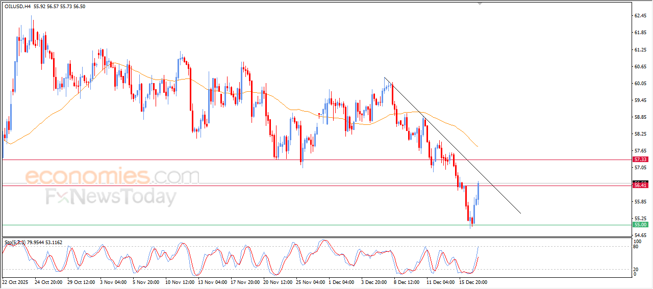 The price of (crude oil) witnessed sharp gains in its last intraday trading, supported by the emergence of the positive signals on the relative strength indicators, to retest the resistance at $56.40 level, amid the continuation of the negative pressure that comes from its trading below EMA50, reducing the chances for a sustainable recovery on the near-term basis, especially with its trading alongside steep minor bearish trend line on the short-term basis.
