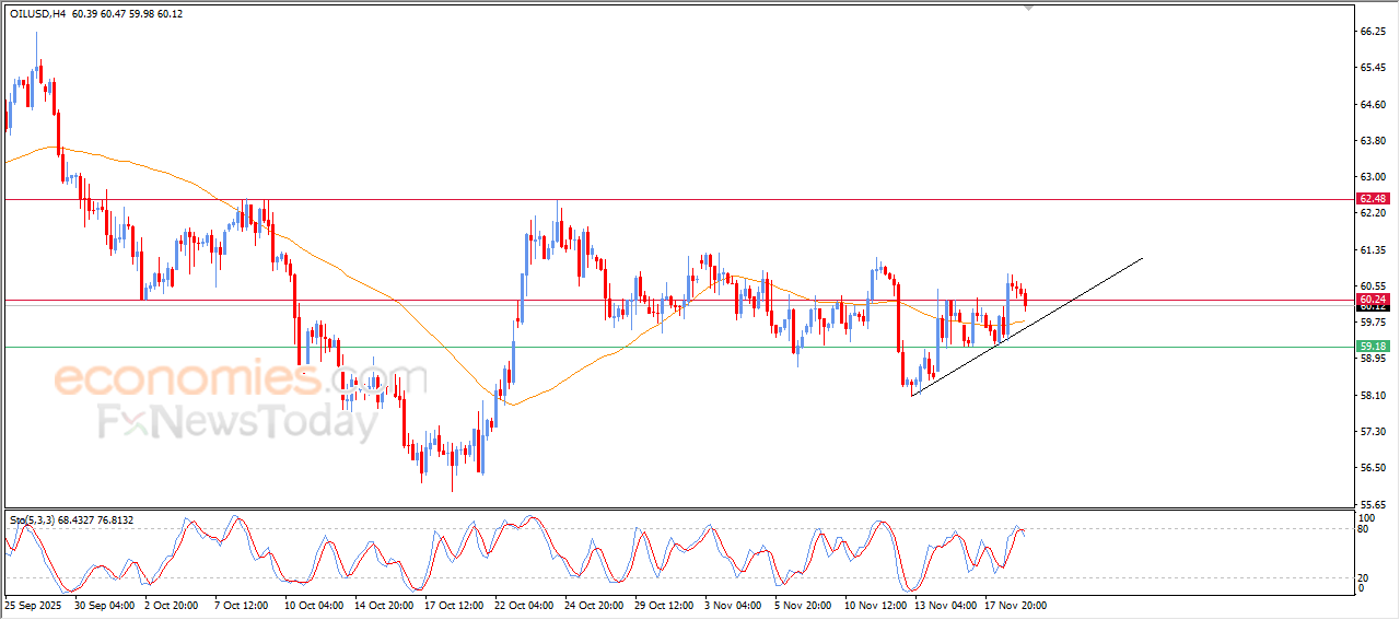 The price of (crude oil) declined in its last intraday trading, in attempt to gain bullish momentum that may help it to rise, and it attempts to offload some of its clear overbought conditions on the relative strength indicators, with the emergence of the negative signals from there, amid the continuation of the positive pressure that comes from its trading above EMA50, and under the dominance of minor bullish channel on the short-term basis and its trading alongside trendline.