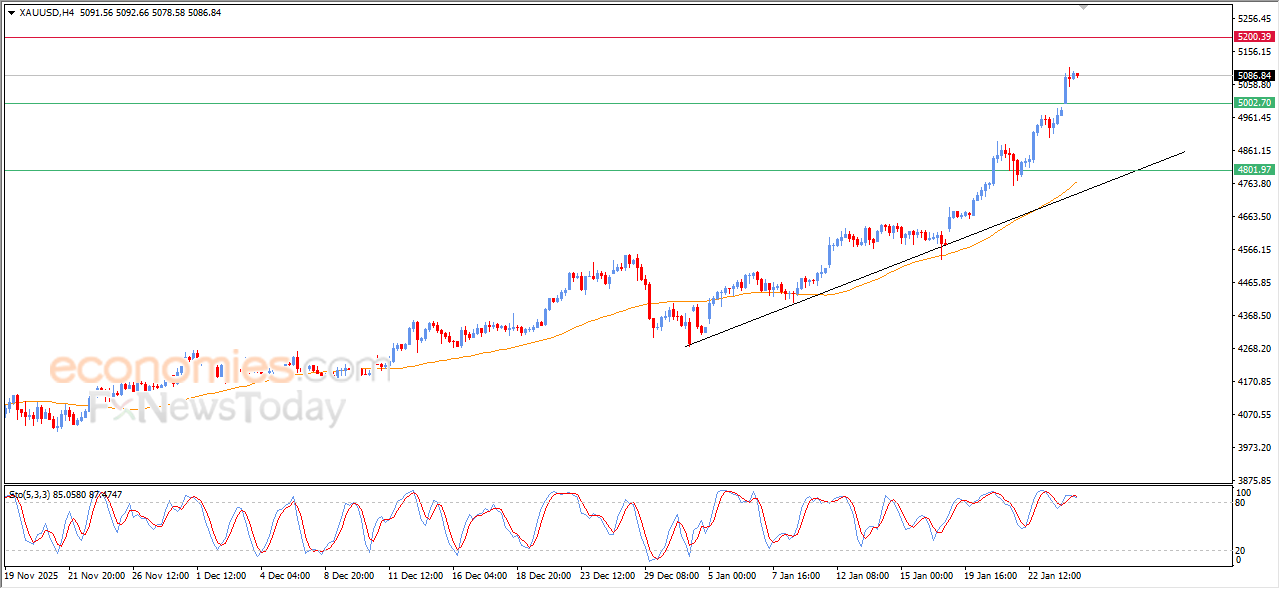 Therefore, our expectations suggest a rise in gold price in its upcoming intraday trading, especially if it settles above $5,000, targeting the next resistance at $5,200.