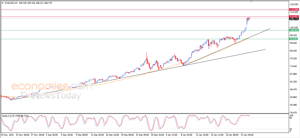 The price of (silver) settles on gains in its last intraday trading, after reaching the previously expected resistance in our previous analysis at $110.00, to attempt to gather the gains of its previous rises, attempting to offload some of its clear overbought conditions on the relative strength indicators, especially with the emergence of negative signals from there, to gather its bullish momentum that might help it to breaching its current resistance, amid the continuation of the dynamic support that is represented by its trading above EMA50, reinforcing the stability and dominance of the main bullish trend on the short-term basis.
