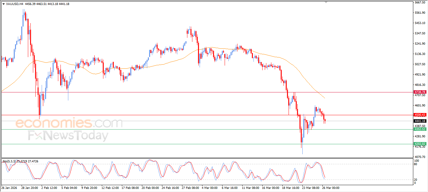 Gold price continued its decline during recent intraday trading, pressured by ongoing negative signals from the relative strength indicators, falling back below the $4,500 support level. This performance comes amid persistent negative pressure as the price trades below EMA50, reinforcing the dominance of the short-term bearish trend and increasing the likelihood of further downside in the near term.