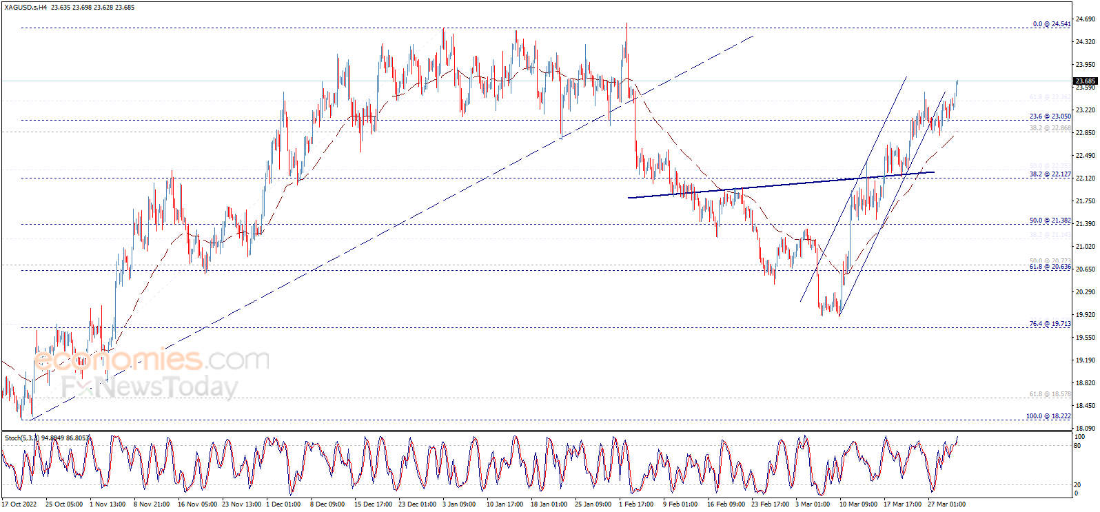 Silver prices rallies upwards strongly to approach our first waited target at 24.00, to support he expectations of continuing the bullish trend in the upcoming sessions, noting that surpassing the mentioned level will push the price to 24.50 as a next target.