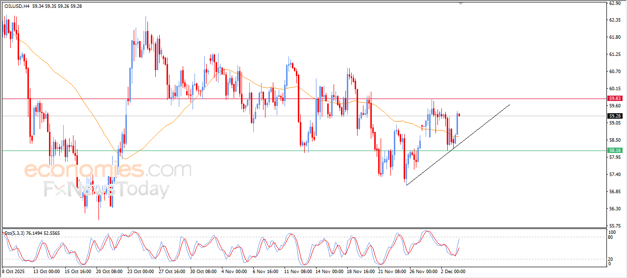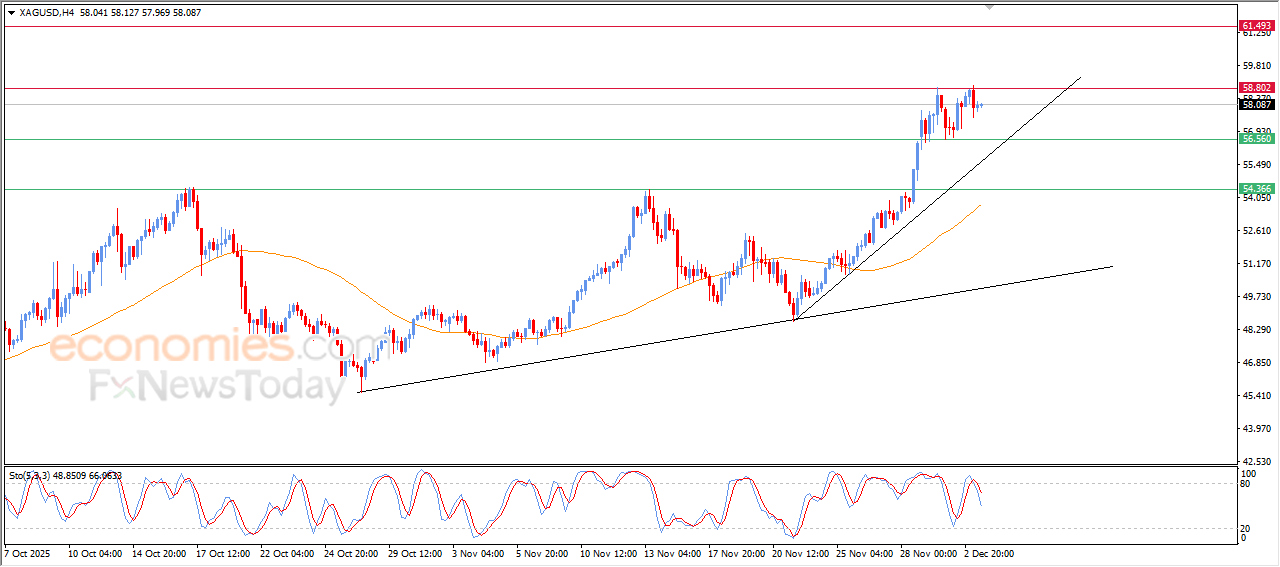 Silver declined in its latest intraday trading after the important resistance level at $58.80 held, as the price attempts to acquire positive momentum that may help it break this resistance. At the same time, silver is trying to relieve part of its clear overbought saturation on the RSI indicators, especially with the arrival of negative signal inflows. This comes under the dominance of the main short-term ascending trend, with the price moving alongside both primary and secondary trendlines that support this path.