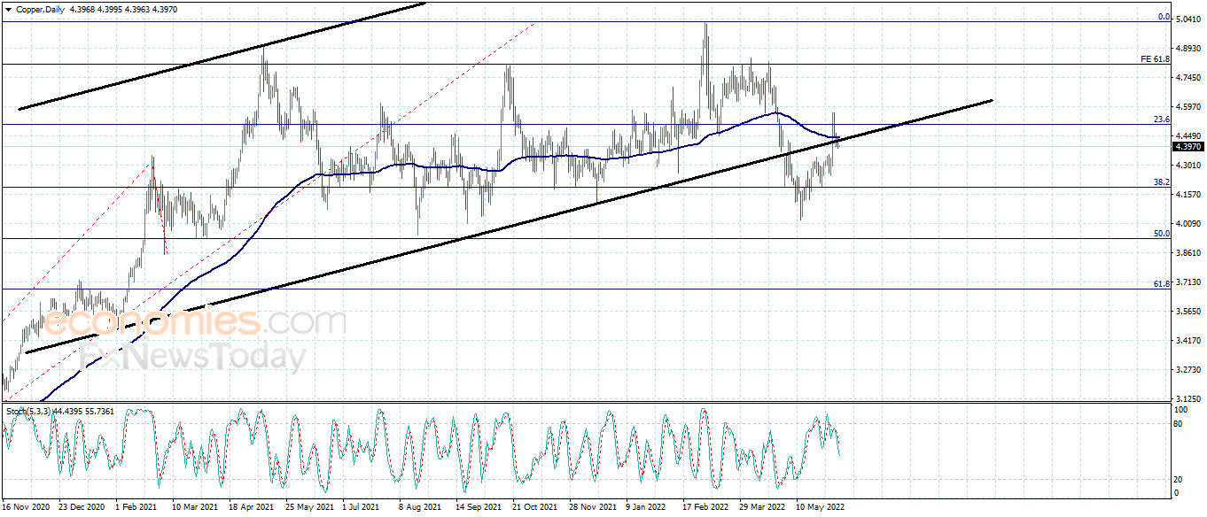 Copper price failed to confirm breaching 4.4900 barrier, to force it to postpone the bullish attempts and start crawling negatively to settle near 4.4000, also, stochastic decline below 50 might assist to activate the negative trades to expect suffering intraday losses by moving towards 4.3100 and 4.1800 levels.