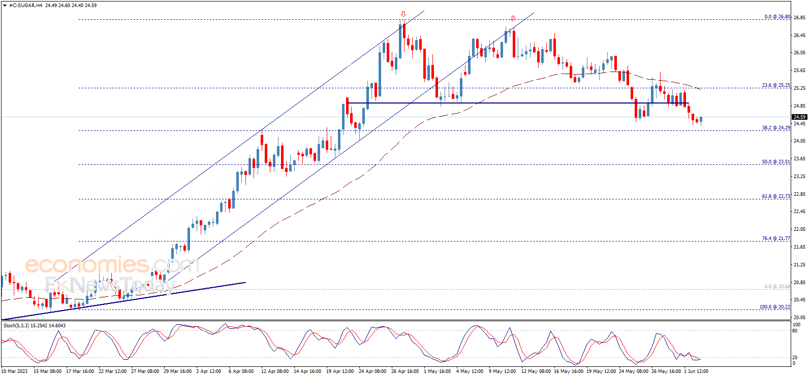 Sugar price continues to decline to reach the thresholds of the waited target at 24.30, which represents 38.2% Fibonacci correction level for the rise measured from 20.22 to 26.80, thus, breaking it will extend the bearish wave to reach 23.50 areas.