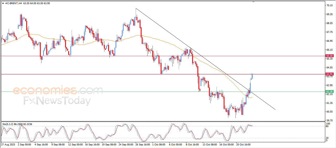 The (Brent) price witnessed sharp gains during its last intraday trading, affected by breaching main bearish trend line on the short-term basis, supported by its continuous trading above EMA50, reinforcing the stability of this positive scenario, to attack the current resistance at $63.95, on the other hand, we notice the emergence of the negative signals on the relative strength indicators, after reaching overbought levels, which might obstructs the rise temporarily in the upcoming period.