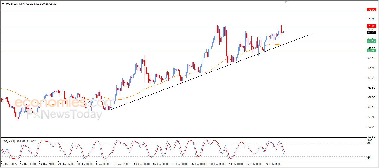 The (Brent) price settles on a decline in its last intraday trading, due to the stability of the key resistance at $70.00, this resistance represents expected target in our previous analysis, amid the continuation of the dynamic pressure that is represented by its trading above EMA50, reinforcing the strength and dominance of the main bullish trend on short-term basis, especially with its trading alongside trend line, noticing that the relative strength indicators reached exaggerated oversold levels compared to the price move, indicating the emergence of a new bullish momentum.