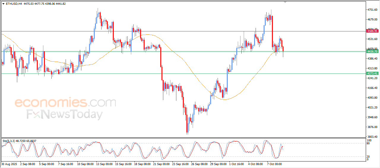 The (ETHUSD) price declined in its last intraday trading, surpassing the support of its EMA50, putting it under negative pressure that intensifies with the emergence of the negative signals on the relative strength indicators, after reaching overbought levels, preparing to break the critical support of $4,435, under the dominance of bearish corrective wave on the short-term basis.