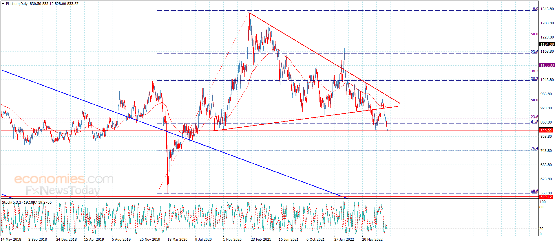 Platinum price reached the next negative target at 825.00 yesterday, affected by the negative pressures that are represented by the stability of the barrier at 855.00 besides the continuation of providing negative momentum by the main indicators until this moment.