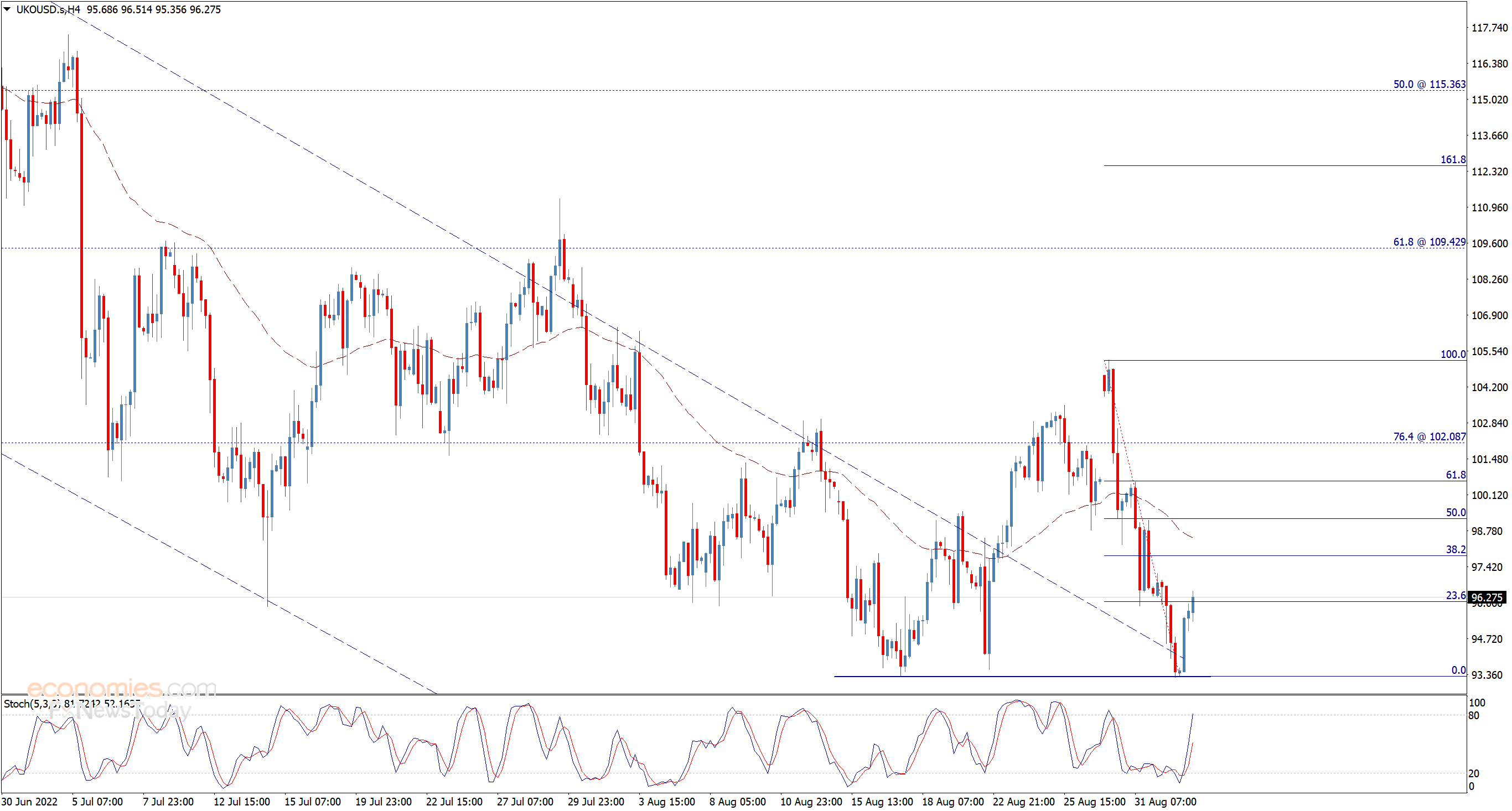 Brent oil price keeps rising to surpass our first positive target at 96.10, reinforcing the expectations of extending the correctional bullish wave to reach 97.80 as a next target, to continue suggesting the bullish trend for the rest of the day supported by stochastic positivity unless breaking 93.30 and holding below it.