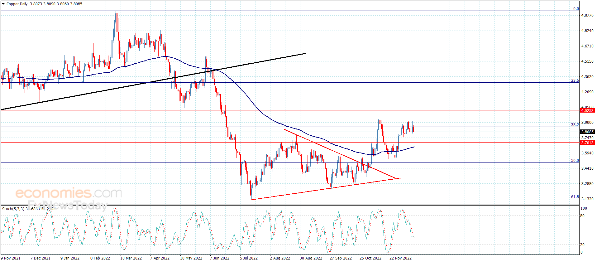 Copper price returned to provide slow trades after failing to confirm breaching 3.9000 obstacle, in addition to stochastic decline below 50 level, expecting to continue forming sideways trades with chances of declining temporarily towards 3.7000, to provide new chances to gather the positive momentum.