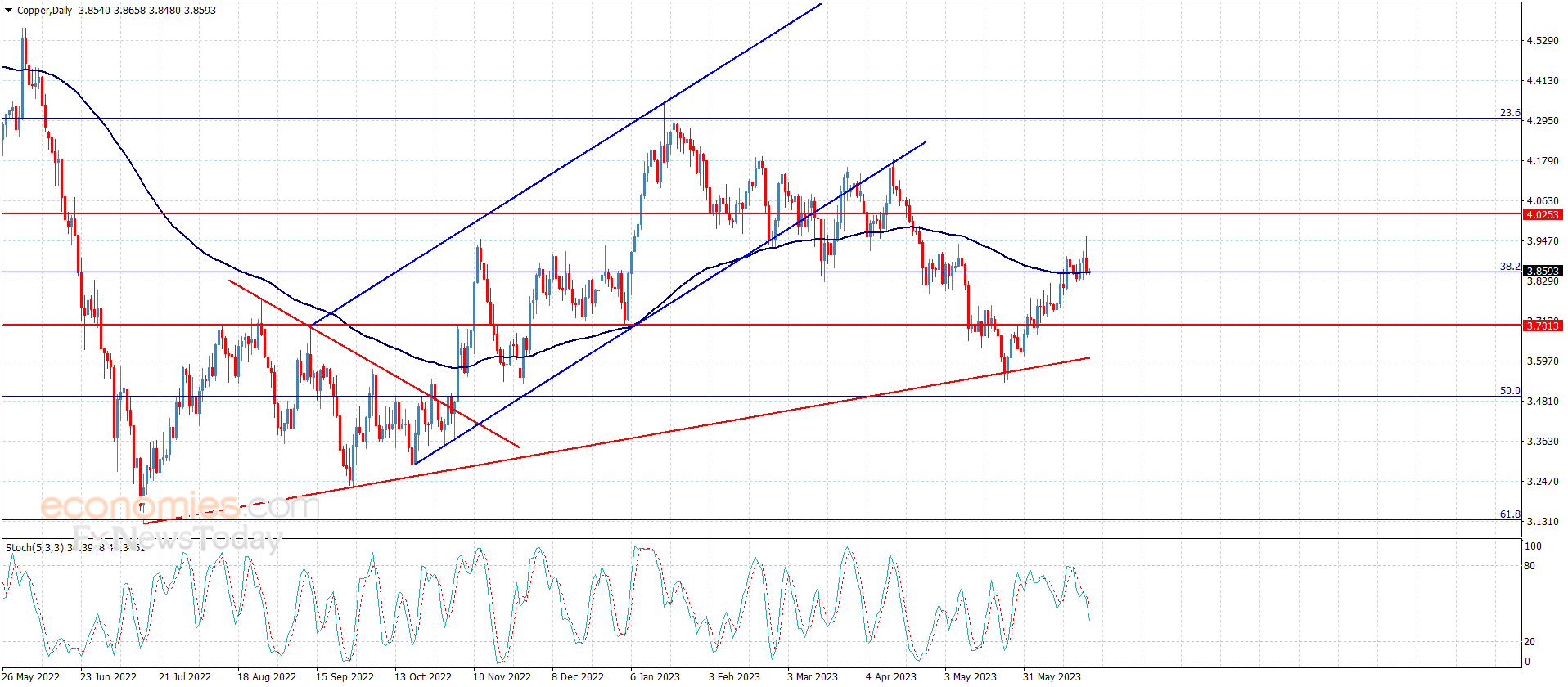 Copper price returned to form correctional bearish waves, surrendering to stochastic negativity, forcing it to decline towards the MA55 at 3.8500.