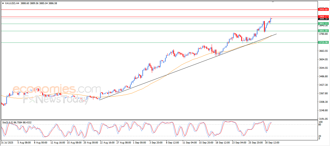 The price of (gold) approached from the resistance barrier of $3,900 for the first time in its history on its intraday levels, supported by its continuous trading above EMA50, and under the dominance of the main bullish trend on the short-term basis and its trading alongside bias line, besides the emergence of the positive signals on the relative strength indicators, despite reaching overbought levels, which reduces the upcoming gains.