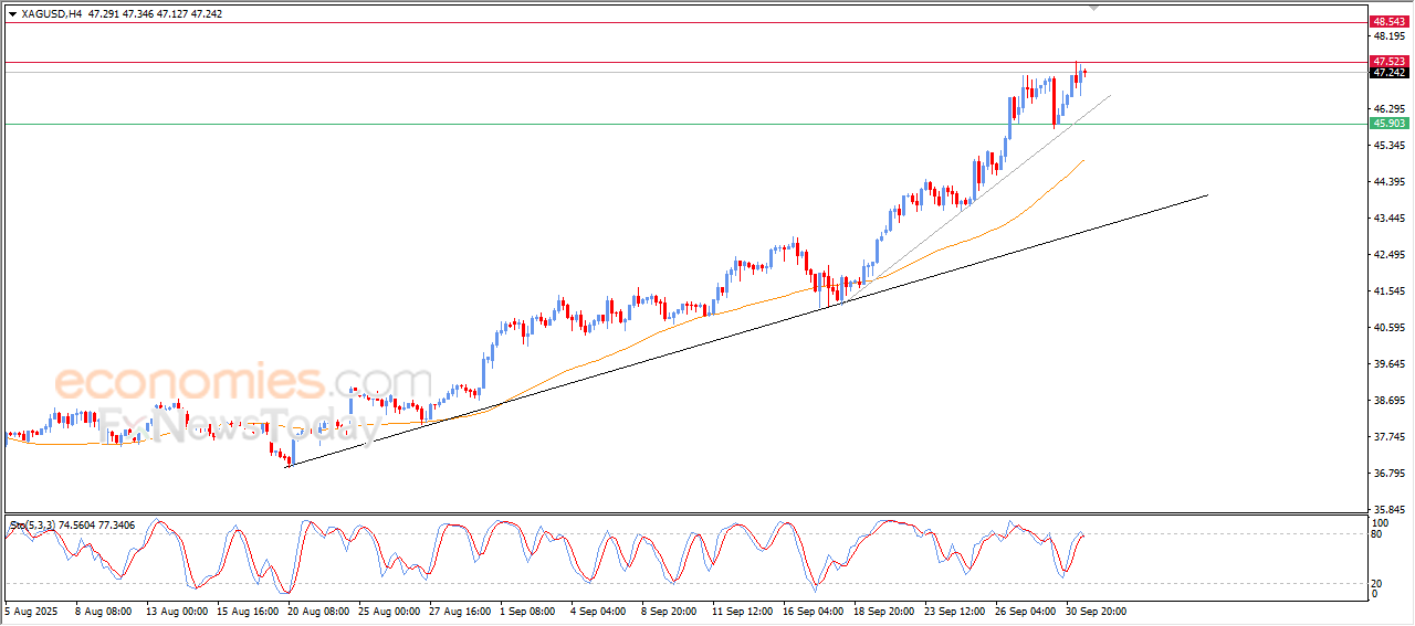 The price of (silver) settled gains in its last intraday trading, attempting to reach the current resistance level at $47.50, amid the dominance of the main bullish trend on the short-term basis and its trading alongside main and minor trend lines that indicates the strength and dominance of this track, besides the emerging of positive signals from the relative strength indicators, and the continuation of the positive pressure that comes from its trading above EMA50, which represents dynamic support that assist the stability of the bullish track.