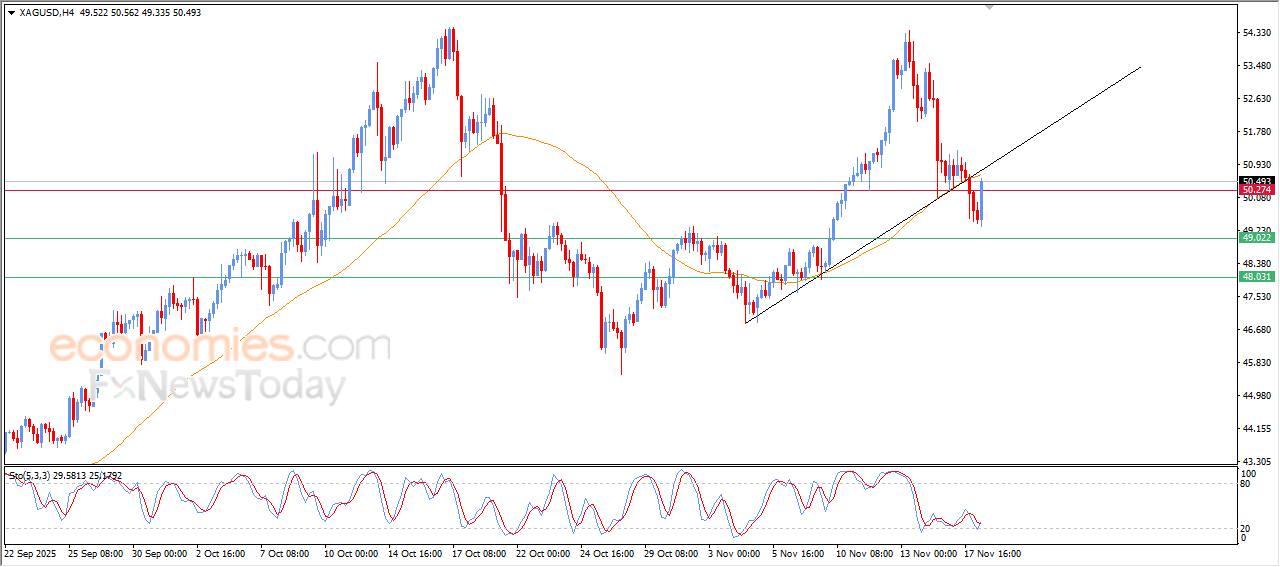 The price of (silver) surged high on its last intraday trading, supported by the emergence of positive overlapping signals on the relative strength indicators, after reaching oversold levels, attempting to recover its previous losses, offloading some of the oversold levels, hitting the resistance of EMA50, accompanied by retesting minor bullish trend line on a short-term basis.