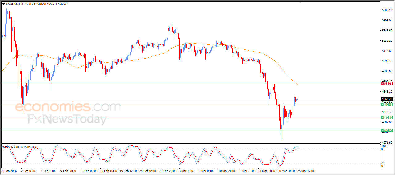 Gold price witnessed slight gains during its recent intraday trading, as it attempts to build positive momentum that may help it resume its earlier gains for today. At the same time, it is trying to relieve some of its clear overbought conditions indicated by the relative strength indicators, with the emergence of a negative crossover, this comes amid the strong dominance of a short-term bullish corrective wave. However, on the other hand, negative pressure persists due to the price trading below EMA50, which may act as an obstacle if the corrective gains continue.