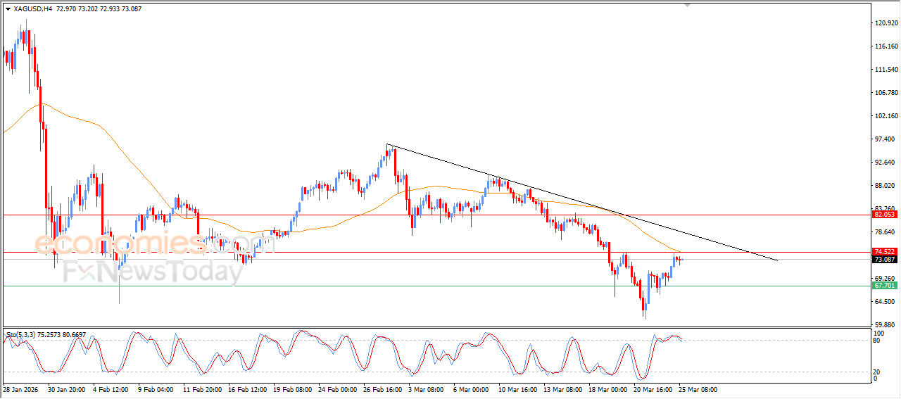 Silver price is holding onto its early gains for today, but it is facing negative pressure after reaching the resistance of EMA50. This limits the chances of extending those gains in the near term, especially with the emergence of negative signals from the relative strength indicators after reaching heavily overbought levels, amid the dominance of a short-term bearish trend, with price movements aligned along a minor trendline supporting this downward path.