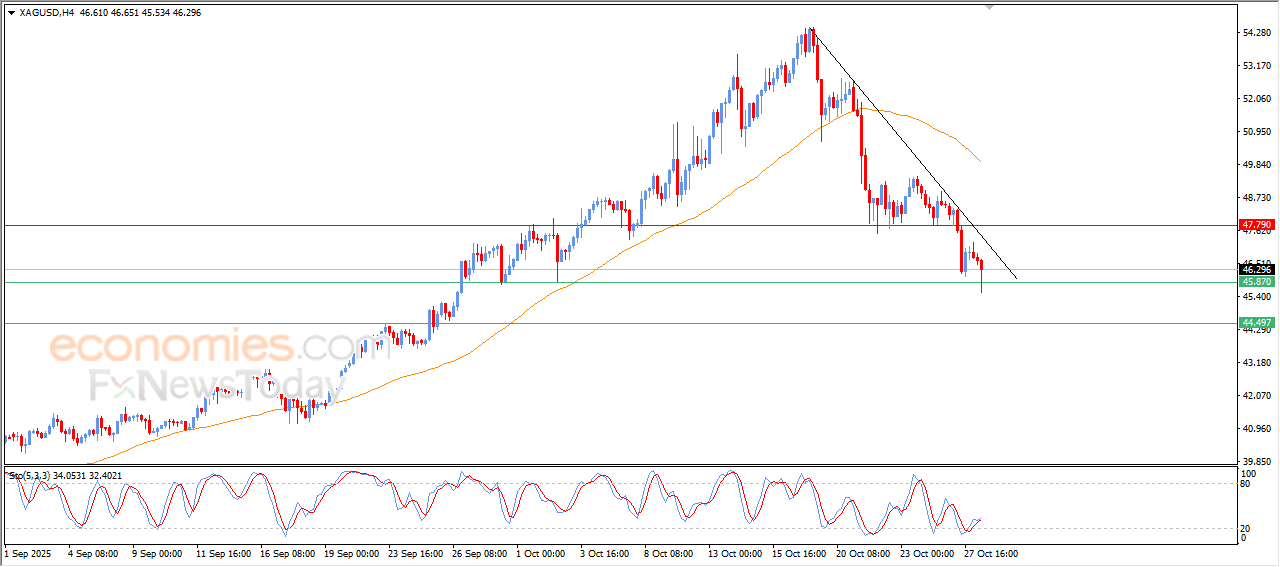 The price of (silver) declined during its last trading intraday trading, to lean on the key support at $45.90, which represents our expected target, amid the dominance of the bearish corrective trend on the short-term basis, and its trading alongside supportive trendline, with the continuation of the negative pressure that comes from its trading below EMA50, besides offloading its oversold conditions on the relative strength indicators, intensifying the negative pressures.