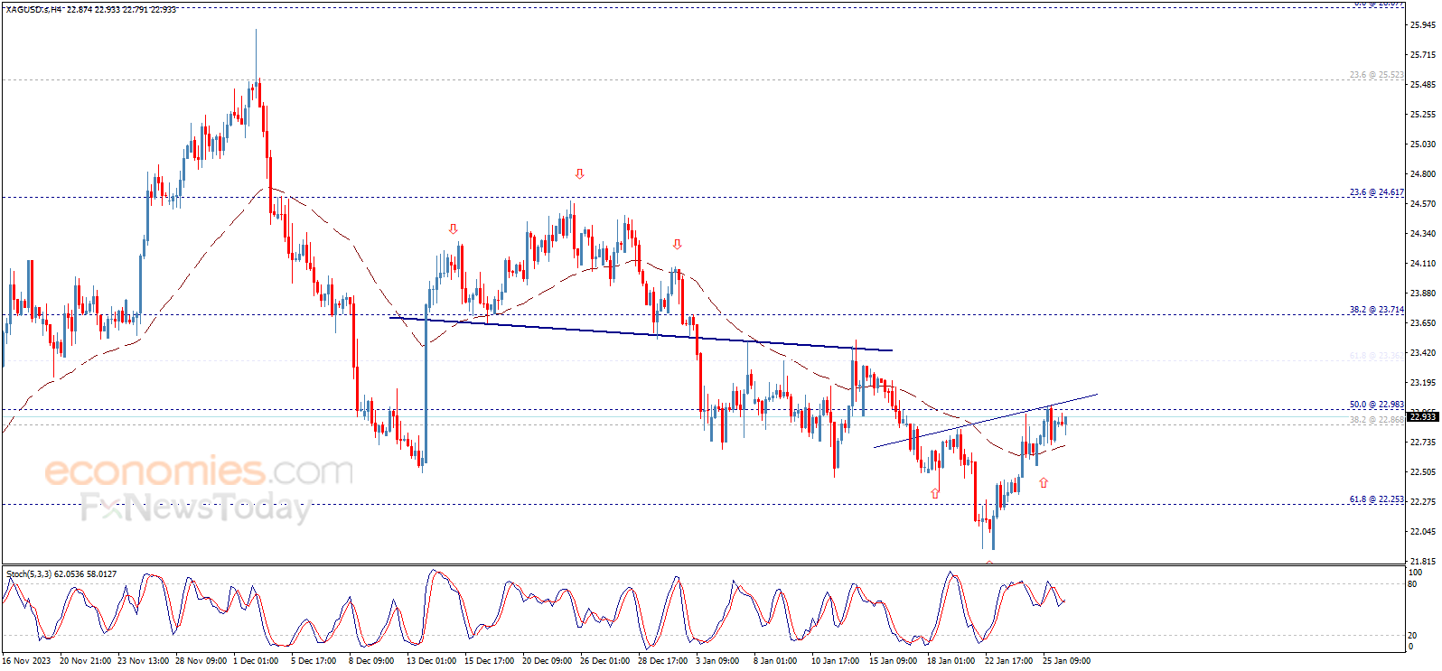 Silver price fluctuates within sideways and tight track since morning, settling above the EMA50 that provides the positive support to the price, waiting to breach 23.00 to activate the positive effect of the inverted head and shoulders’ pattern that appears on the chart, reminding you that our next main target is located at 23.70, while achieving it requires holding above 22.65.