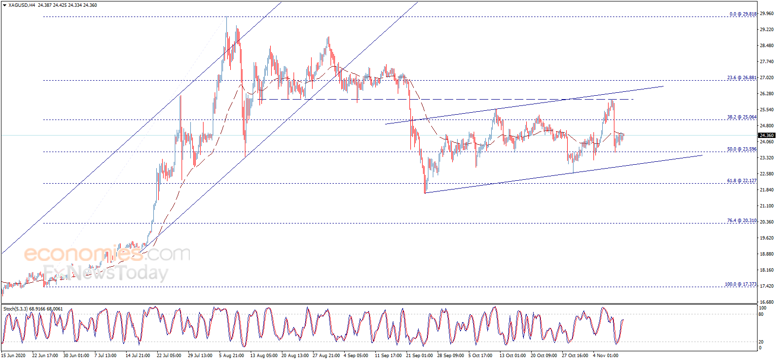 The EMA50 continues to form solid resistance against silver price’s positive attempts, waiting to surpass this level to confirm the continuation of the intraday bullish wave, which targets testing 25.06 level initially, noting that surpassing this level will extend silver price gains to reach 26.00 followed by 26.88.