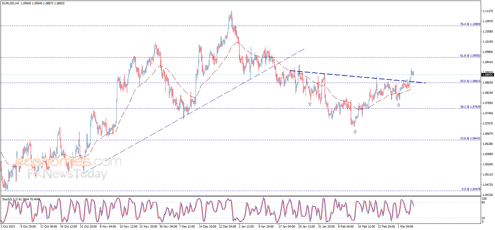 The EURUSD pair shows some slight bearish bias, affected by stochastic negativity, and it might retest the breached neckline of the inverted head and shoulders’ pattern at 1.0860 before turning back to rise again.