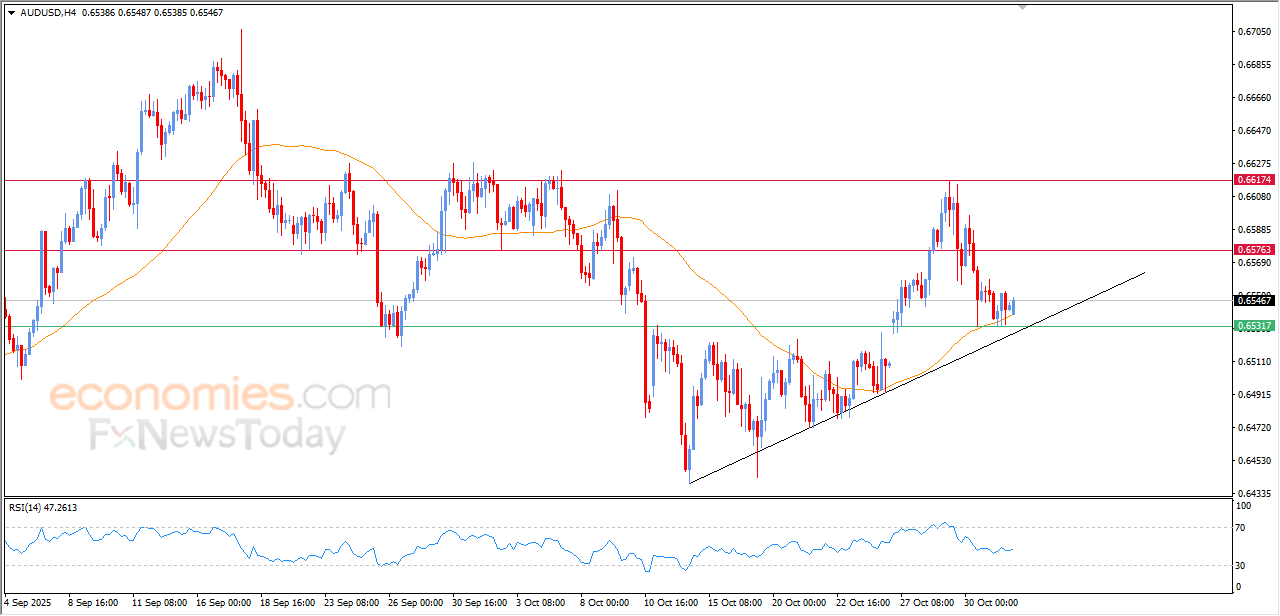 The (AUDUSD) price rose in its last intraday trading, amid the price’s attempts to recover, especially after it leaned on the support of its EMA50, which provided bullish momentum that intensified with the emergence of the positive signals on the relative strength indicators, after reaching oversold levels, exaggeratedly compared to the price move, indicating the beginning of forming positive divergence, amid the bullish corrective trend on the short-term basis and its trading alongside trend line that reinforces the stability of this track.