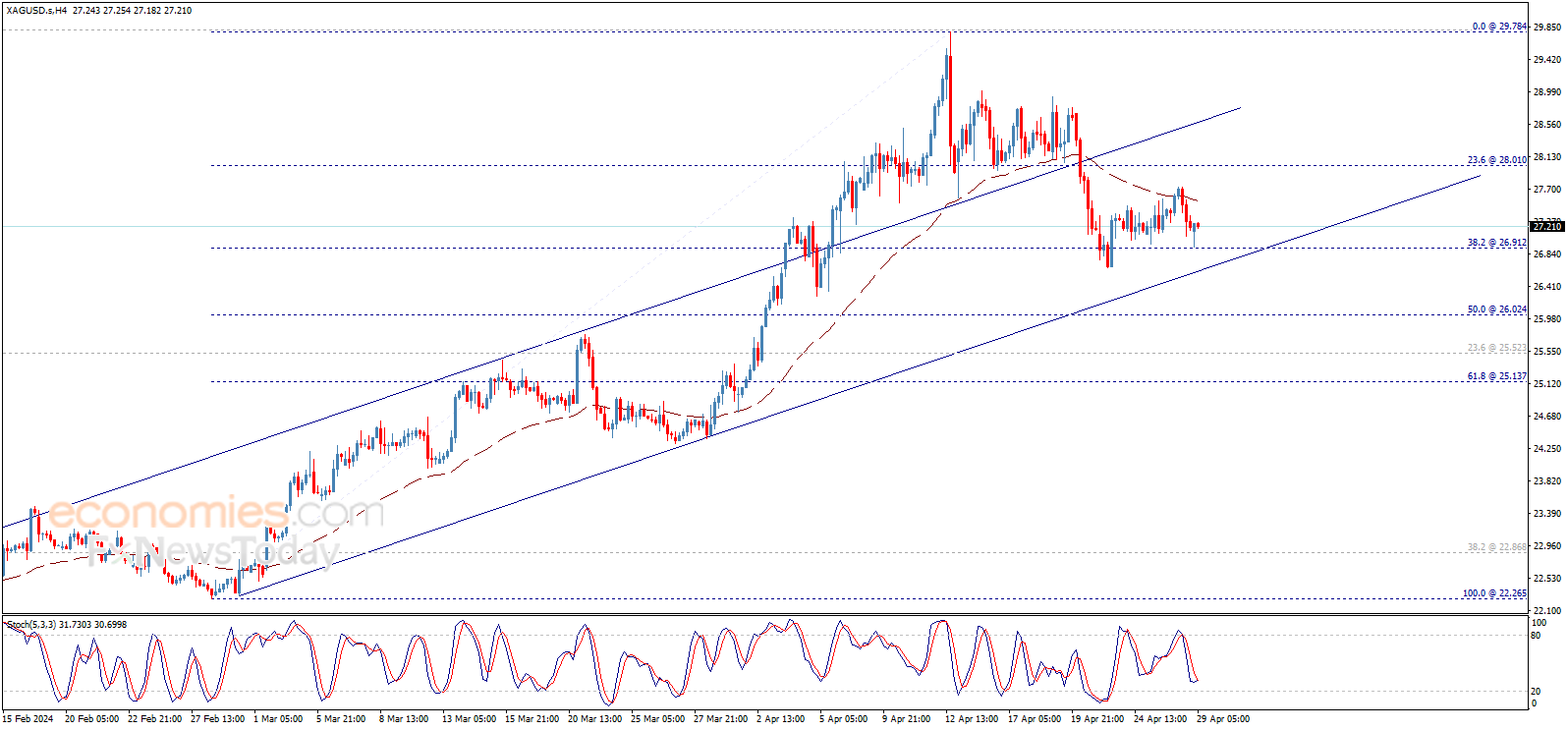 We remind you that breaking the mentioned support will push the price to resume the correctional bearish track that its next target reaches 26.00$, while breaching the resistance represents the key to return to the main bullish track, to head towards visiting 28.80$ followed by 29.80$ levels as next positive targets.