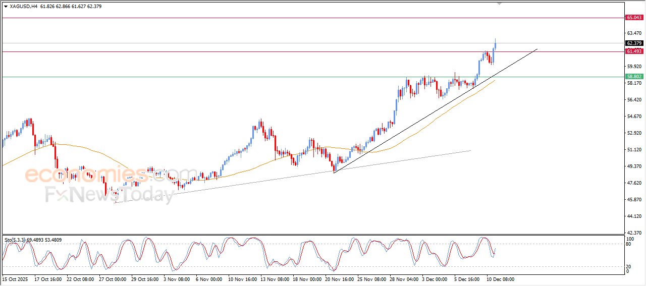 Silver price continued the rise in its last intraday trading, breaching the current resistance at $61.50, supported by its continued trading above EMA50, forming dynamic support that keeps the stability and dominance of the main bullish trend on the short-term basis, especially with its trading alongside trend line, besides the emergence of positive signals on the relative strength indicators, after offloading its overbought levels, opening the way for achieving more of the gains on the near-term basis.