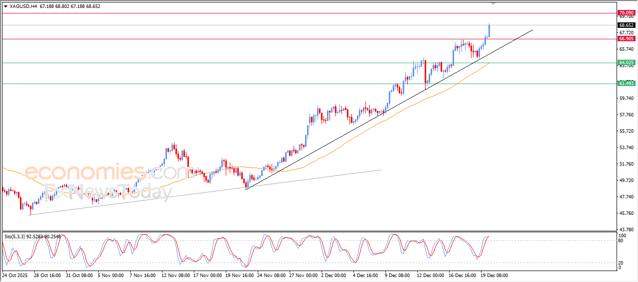 Silver price soared during its last intraday trading, breaching $66.90 key resistance, which represents a target in our previous analysis, amid the continuation of the dynamic pressure that is represented by its trading above EMA50, and under the dominance of the main bullish trend on the short-term basis, with its trading alongside supportive trend line, besides the emergence of positive signals on the relative strength indicators, despite reaching overbought levels.