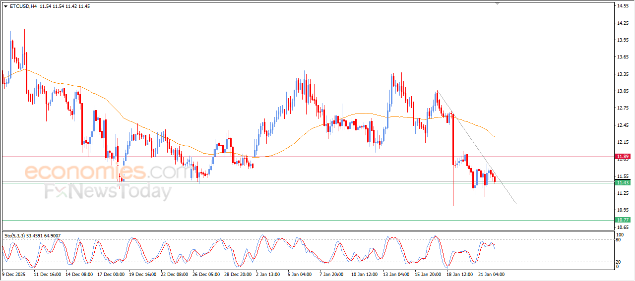 Ethereum Classic (ETCUSD) price recorded a decline in its latest intraday trading, amid continued negative pressure from trading below its SMA50, as the price currently prepares to break the key support level at $11.40. This comes under the dominance of the main downward trend, with price action moving within a steep short-term minor wave, alongside incoming negative signals from the RSI after it reached extremely overbought levels.