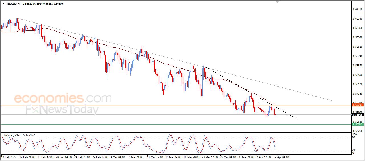 The (NZDUSD) declined during its latest intraday trading, amid full control of a main bearish trend in the short term, with the pair moving alongside major and minor trendlines supporting this bearish path.