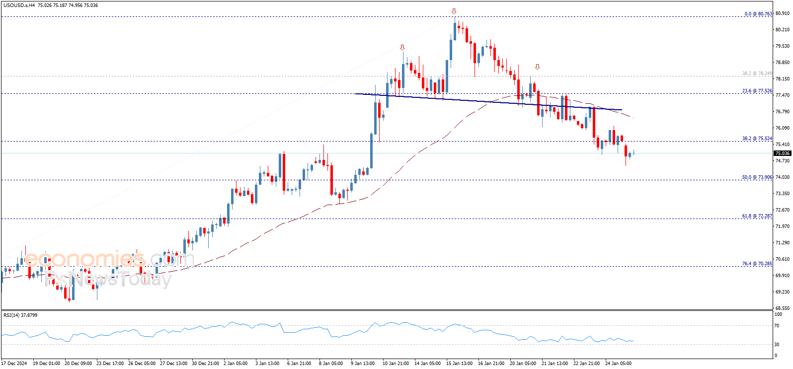 Crude oil price shows some slight bullish bias now, and it might test 75.53$ before turning back to decline again.