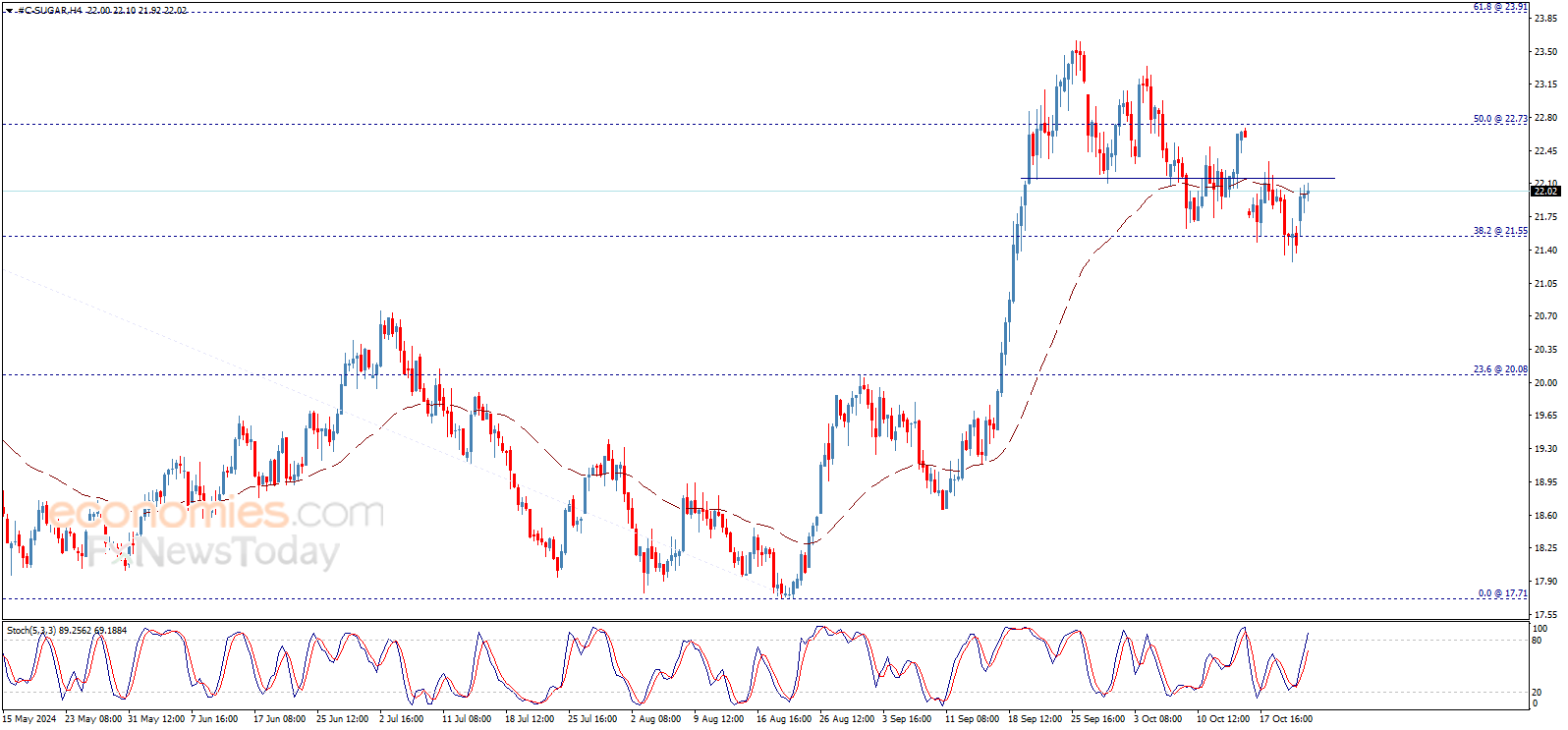 Sugar price traded with clear positivity yesterday to retest the broken neckline of the double top patter around 22.15$, noticing that stochastic loses its positive momentum clearly to reach the overbought areas, which supports the chances of bouncing bearishly to resume the expected bearish trend on the intraday basis, which its targets begin at 21.55$ and extend to 20.80$.