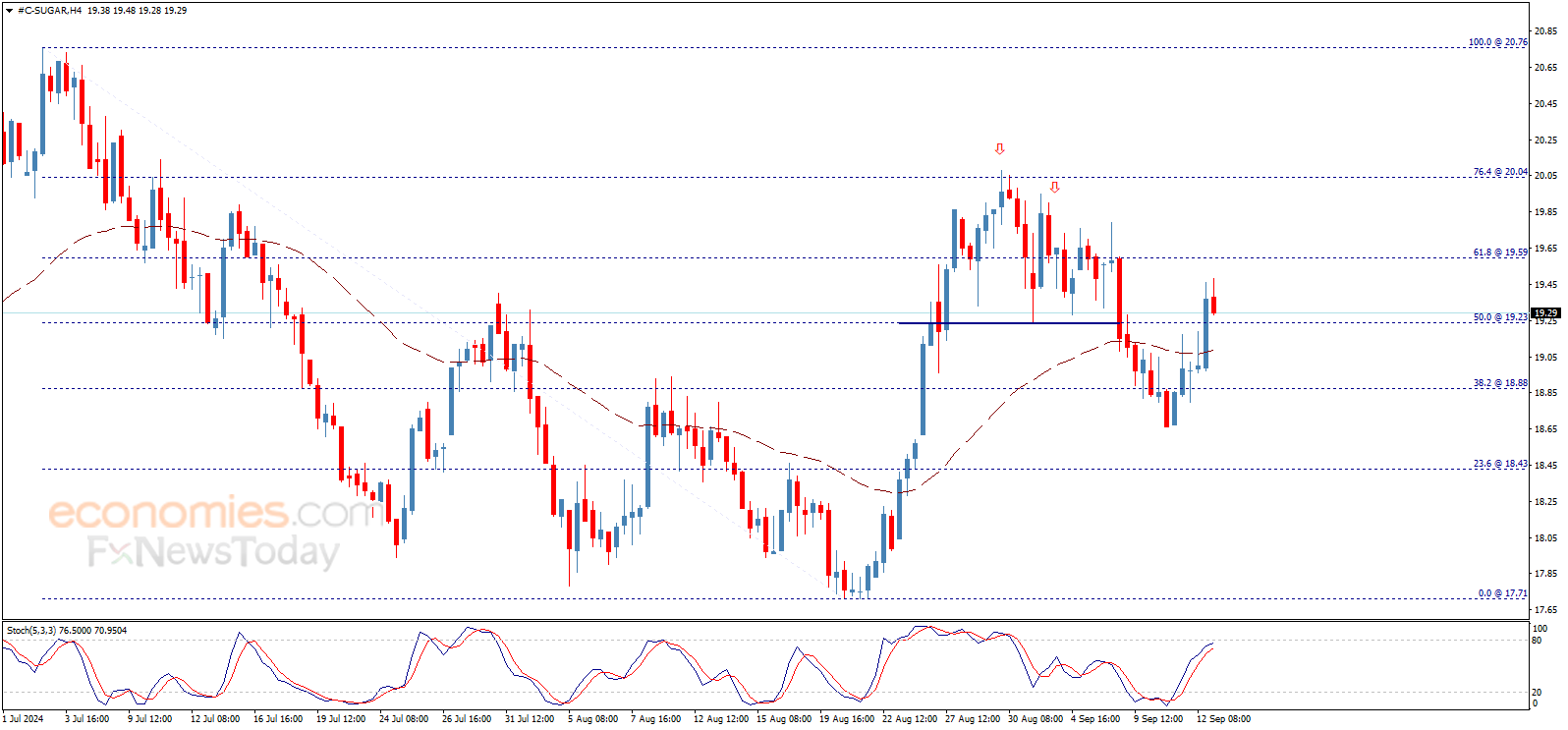 Sugar price ended yesterday with strong positivity, as it breached 19.23$ level and settled above it, to cancel the negative effect of the double top pattern and head towards achieving expected gains on the intraday basis, targeting testing 19.60$ followed by 20.04$ levels as next positive stations.