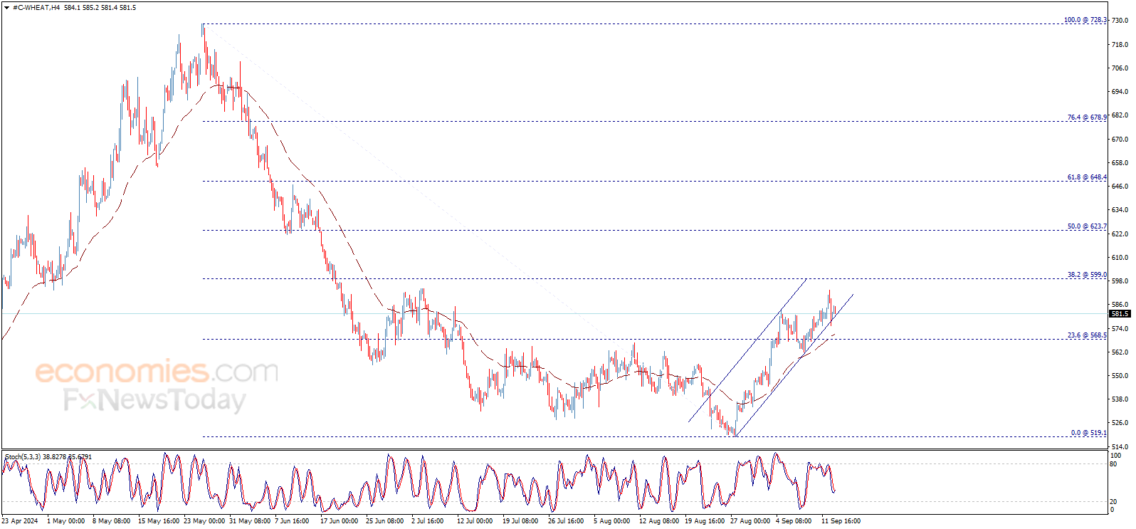 Wheat price provided additional positive trades yesterday to approach the waited target at 599.00$, and continues to move inside the bullish channel that supports the chances of surpassing the mentioned level and achieve more bullish correction on the intraday and short-term basis, to extend the targets towards 623.70$.