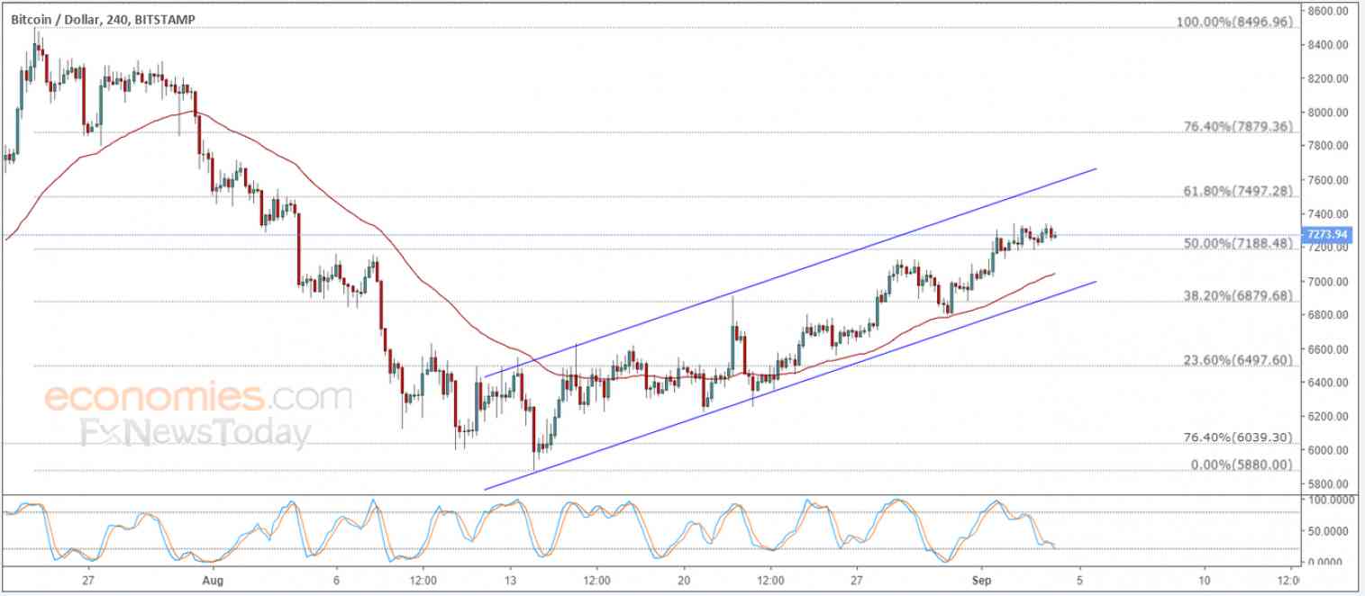 Bitcoin price settles above the support base that it formed above 7188.50 level, getting continuous positive support by the EMA50, to keep the price organized inside the bullish channel that appears on the chart, waiting for more rise in the upcoming sessions, as our next target is located at 7500.00.